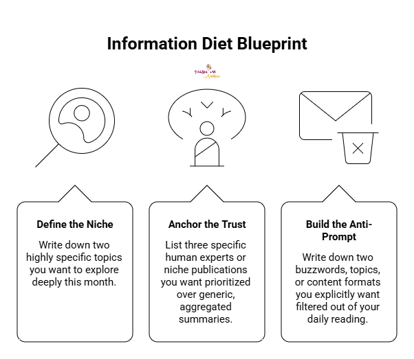 Keep this three-part blueprint visible on your desk. The next time you set up a new app, sign up for a newsletter, or run a search, use these exact parameters to guide your inputs. You are no longer waiting for a black box algorithm to guess what you value. You are taking the controls.